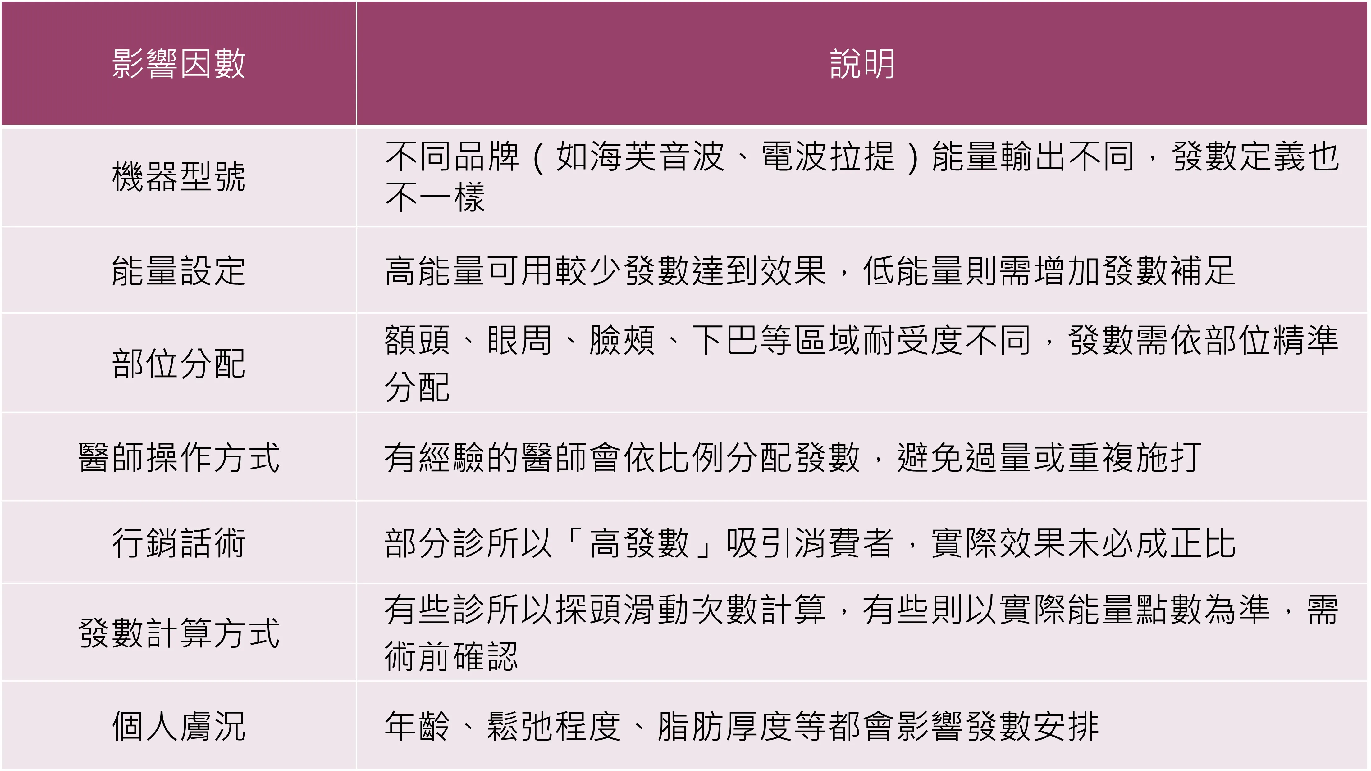 根據 PTT 醫美板的討論,電音波療程的「發數」並沒有絕對標準,而是受到多種因素影響,包括機器型號、能量設定、施打部位、醫師經驗與個人膚況。以下表格統整常見影響因素與網友分享的經驗: