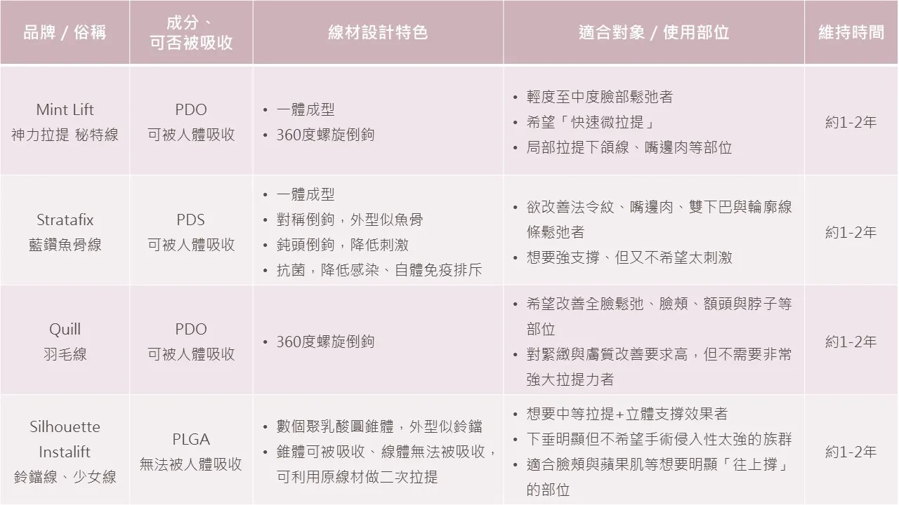 - 膠原蛋白的再生作用:當線材被分解時,會同時刺激膠原蛋白增生,使肌膚厚度增加、彈性提升,讓拉提效果更持久。