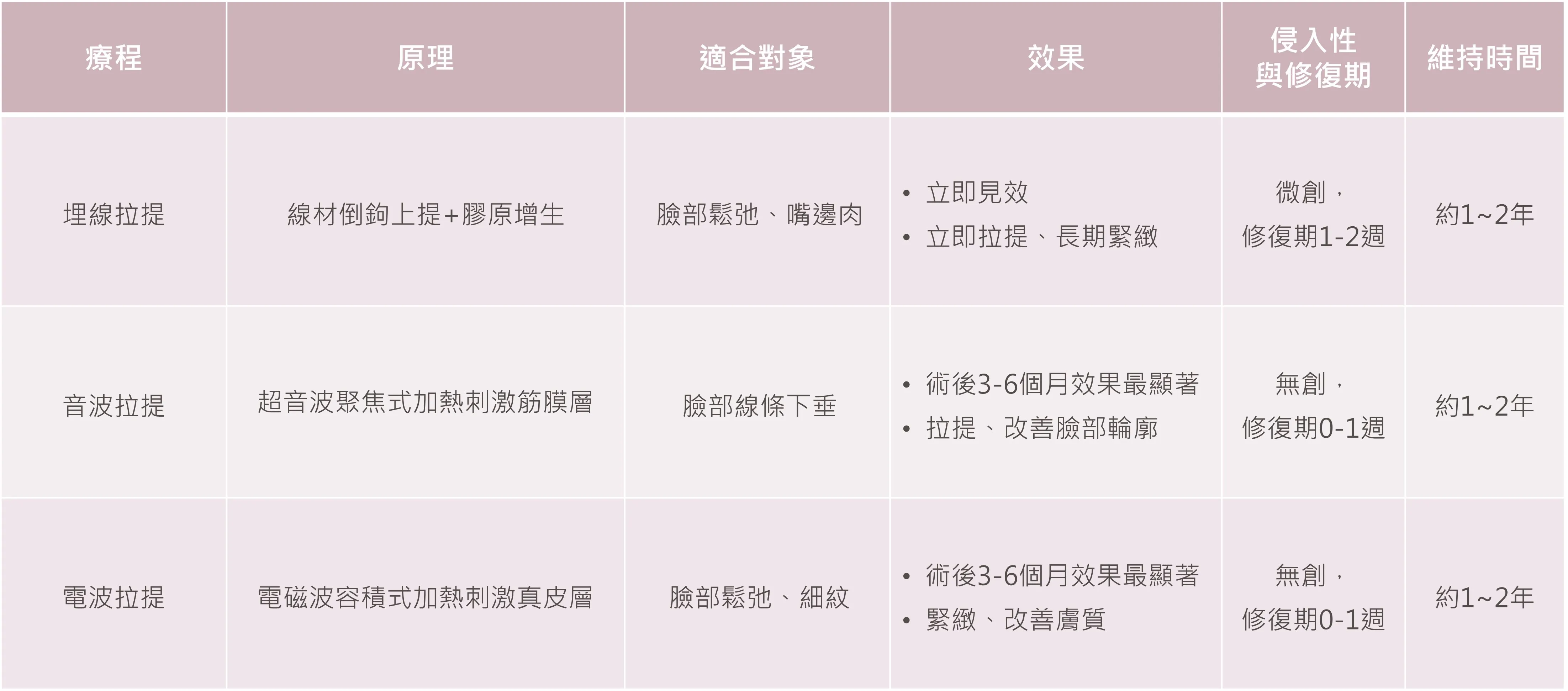 埋線拉提、音波拉提、電波拉提,三個療程都稱為「拉提」,但作用原理、效果…等卻大不同。以下比較三個療程的差異: