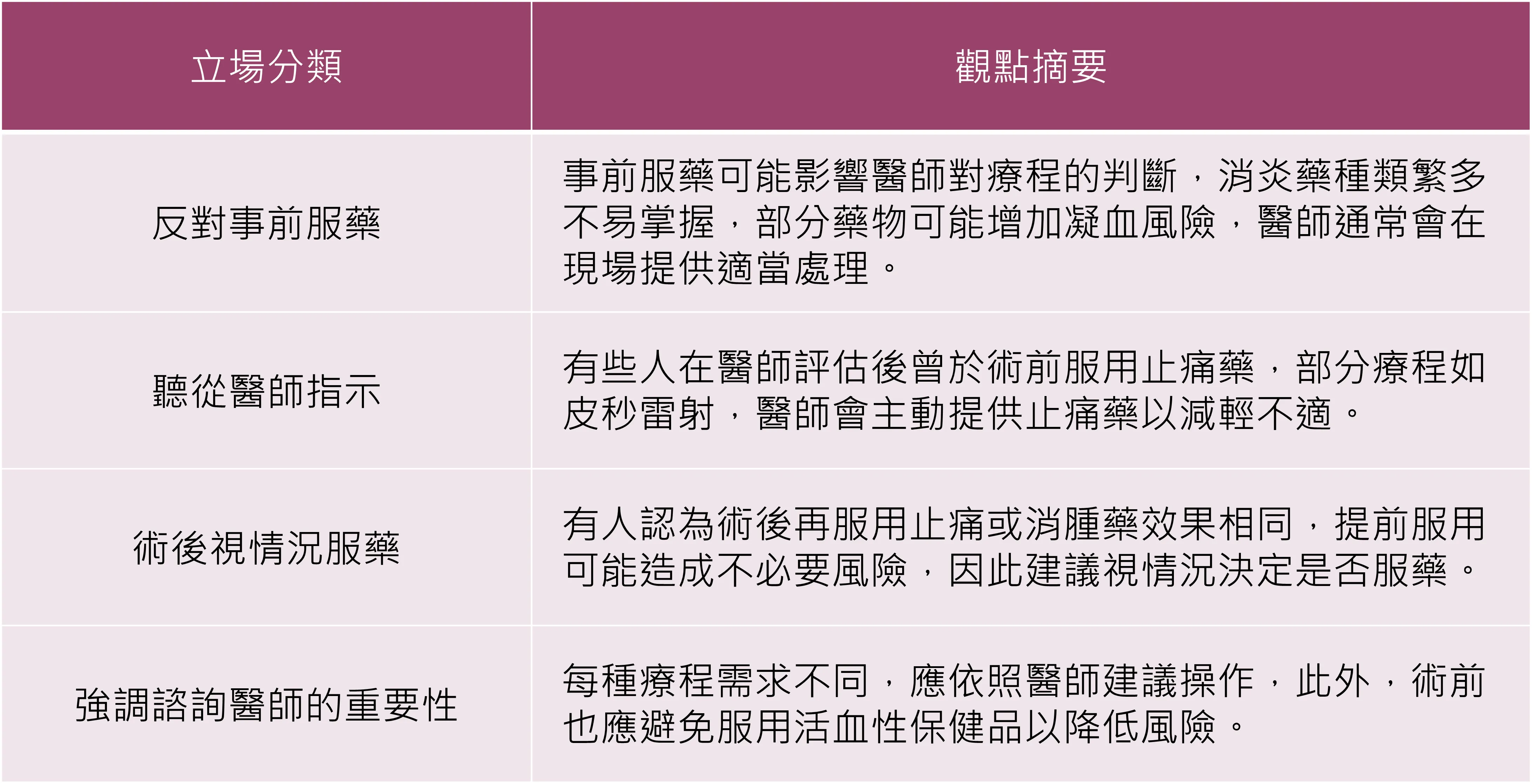 從PTT醫美板的留言來看,絕大多數網友都傾向在療程前盡量避免自行服用消炎或止痛藥,尤其是未經醫師指示的情況下,擔心藥物可能影響療程判斷、增加腫脹或凝血風險,並認為術後再視情況服藥更為安全。