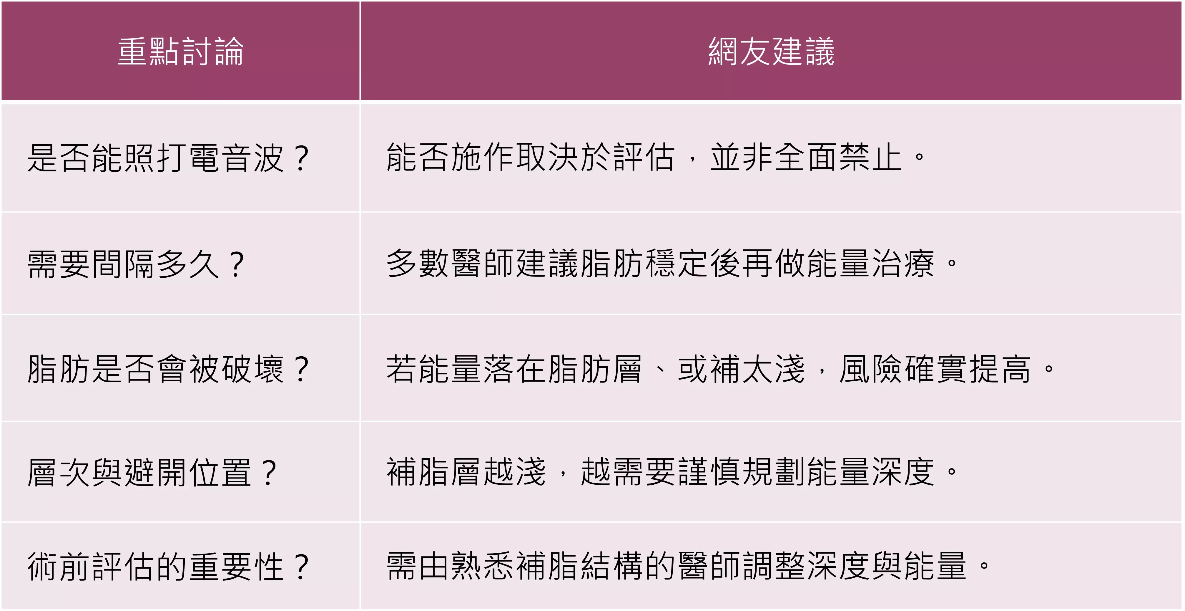 PTT醫美板網友普遍認為,補脂後的電音波並不是「能不能做」這麼簡單,而是要有完整的長期規劃。包含定期追蹤脂肪存活、了解補脂層次、與醫師討論能量深度與探頭選擇,才能降低補脂被破壞的風險,也有網友提醒,若對補脂層次不確定或已有凹陷狀況,應優先回原醫師評估,而不是直接更換療程或臨時找其他診所施作。醫師熟悉你的補脂位置,才能更精準避開風險區域,讓後續拉提治療維持效果又不傷脂肪。