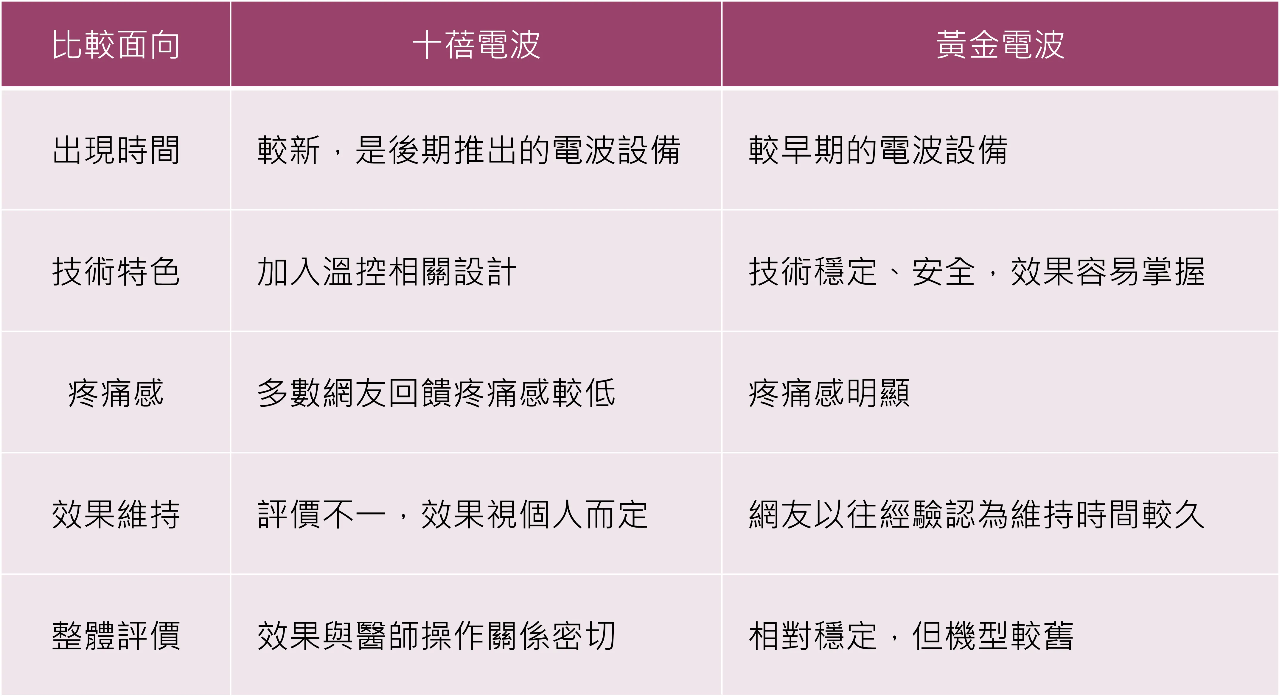 從表格可以看出,十蓓電波與黃金電波各有優勢與限制,除了設備本身的差異,PTT醫美板的討論中,也出現幾個值得注意的補充觀點: